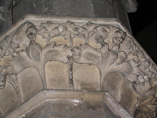 Sir Richard de Bingham or Byngham (b 1278 d 1307, buried Bingham, Nottinghamshire) married Alice Bertram (b about 1283 Bothal Demesne, Morpeth, Northumberland, England, living 1314) and they had a son William (d about 1349) and a daughter Agatha de Bingham (b 1310) married Rafe Bellers. Richard was descended from a wealthy Nottingham wool merchant and Henry III granted the Bingham manor to Ralph Bugg and they took the name of the manor. Carved in stoned from Caen, Normandy. Richard's head rests on a double cushion and he wears a Cervelière (metal cap) beneath a coif of mail fastened by a fillet. The hands are held together in prayer with the mail mittens hanging down the front. The sword has a circular pommel and the sword belt is fastenedd by interlocking thongs. Over his shoulder passes a guige to carry the shield, which used to bear the arms of the Bingham family being Or on a fess gules three water bougets argent. The surcoat has a narrow girdle and is over the hauberk which is split for riding. The knee caps are of plain cuirbouilli and the feet rest on a lion and he wears prick spurs. The hands held in prayer appear to have had a fixture attached to them which may have perhaps once been a heart. Richard was knighted by Edward I and serverd in 2 parliaments. Richard held a knights fee in Bingham in 1285 and serverd on the commission of peace, a commissioner for the collection of lay subsidies and a commissioner of array. In 1300 Richard was comissioner with Robert de Jorz for raising 1500 men for the campaign of Edward I in Scotland. Richard built a private memorial chapel and obtained a license in 1301 to found the chapel and dedicated it to St Helen, and was licensed by the Archbishop of York in 1308. In 1302 Richard was Sheriff of Notinghamshire and Derbyshire in 1302. In 1310 Richard was appointed to survey the castle of Nottingham.
