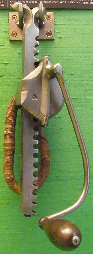 Rabbits as crossbowmen, Romance of Alexander MS Bodl 264 by the Flemish illuminator Jehan de Grise and his workshop 1338-44 81v, Bodleian Library, Oxford, England. In the 14th century, the goats-foot lever was developed with a wooden handle and iron claws, and evolved to be made entirely of iron. It works by hooking onto the string and a lever pulled to draw the string back. It was levered against an iron rod that passed through the tiller behind the lock. Left and centre: crossbow goats-foot, right: spanning hook, Copenhagen National Museum, Denmark. Crossbow goats-foot C15, Museum Adleturm, Dortmund, Germany.