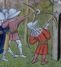 From the mid 12th century horn bows were used, copied from the bows of Asia, this type of bow was made from a wooden core to which the back was attached a thick layer of sinews held together by fish glue, but generally lacking the horn on the belly, see Josef Alm. Goats horns and some ox horns were used in the lands of the Teutonic knights in the 14th century for the cores of composite bows. From the end of the 12th Century the stirrup was used to draw the crossbow, known as spanning.. Variants of crossbow existed such as those with stirrups to take two feet, and large crossbows spanned using a windlass with very large bolts, all these are mentioned to be purchased at Acre in 1239 and in 1269 at Piacenza. Crossbows that shot two bolts are also said to have existed. Mounted soldiers used crossbows and mentioned in mid 13th century Norway, and it was advised that they should not be so powerful that they could not be spanned on horseback. In the 14th century these types of crossbow continued to be used and many fortified places contained crossbows in their inventories. The Genoese became known for good quality crossbows and in providing mercenaries with crossbows. In the mid 14th century the French employed large numbers of Genoses crossbowmen who were reported to take to the field with only 12 bolts each, see W. Boheim. In 1346 the Genoese crossbowmen were defeated by the English at Crecy using the longbow. The Genoese put their loss down to wet bowstrings, see below, wet bow strings fact or myth? |