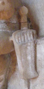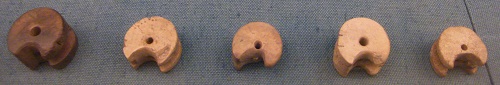 The crossbow stocks shown above are for a crossbow and a childs crossbow. The bow would have sat in the notch on the left and the release mechanism was a pin which pushed the string up. A more elaborate mechanism was developed with a nut that had a segment cut out of it to hold the string. The nut was made of wood, ivory, bone or metal. The nut is not permitted to move until the trigger allows its rotation and the release of the string to propel the bolt forwards. crossbow internal parts, nuts, National Museum, Copenhagen, Denmark |