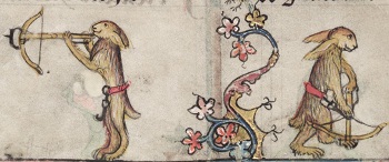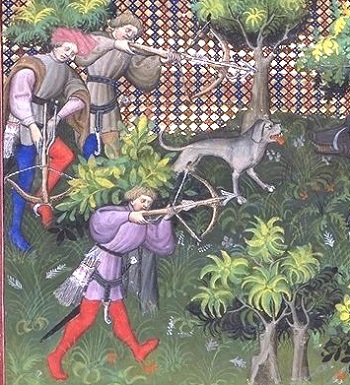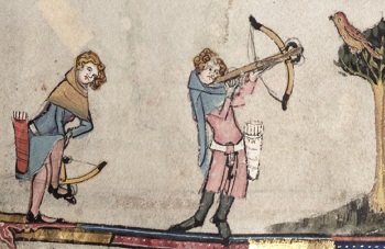 Hunting birds using a blunt bolt, (elsewhere in the manuscript sharp bolts can be seeen with sharp black heads with barbs). Romance of Alexander MS Bodl 264 by the Flemish illuminator Jehan de Grise and his workshop 1338-44 95r.