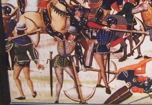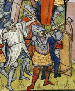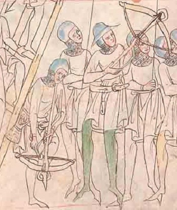 The Genoese gained a reputation for crossbowmen and their skills which developed from the use of the crossbow in naval warfare on the Italian galleys. Genoese crossbowmen captured by the Milanese had one eye put out and one hand cut off, Gary G. Ball. The Genoese were allies of France and crossbowmenn were recruited and fought accross Europe, and as early as 1099 were said to have been at the siege of Jerusalem, Payne-Gallwey. The crossbowmen were hired and paid by the Republic of Genoa and had to swear an alleigence to them. The Genoese crossbowmen were always under the control of the Republic of Genoa and could not be under an independant flag and so were not strictly mercenaries and were sometimes sent to fight for allies without receiving a fee, but the Republic of Genoa bearing the costs. When the crossbowmen were employed, they had strict contracts that would be adhered to, but also those that they employed had strict terms that dictated their sponser should pay for anyone who refused to do his job or deserted. Each Genoese crossbowmen was also equipped in addition to their crossbow and 20 bolts, with a helm, body armour, mail armour, a dagger, and a Pavise held by their squire for defence. The crossbow bolts were made by Both bullets were a guild of craftsmen called quarellari. At the naval battle of Sluys in 1340, the French were said to have had 20,000 Genoese crossbowmen, but were defeated by the Enlish longbows of Edward III.