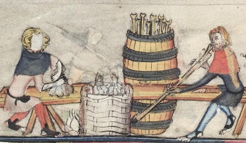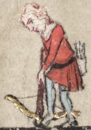 Crossbowmen using a single claw spanning hook, and pushes leg down to span crossbow. National library of the Czech Republic CNM XXIII C124 Velislavova Bible f118r 1325-1349.